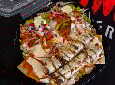 Thin sliced beef marinated in our special blend spices and slowly cooked on stand-up rotisserie. Served with rice and salad.