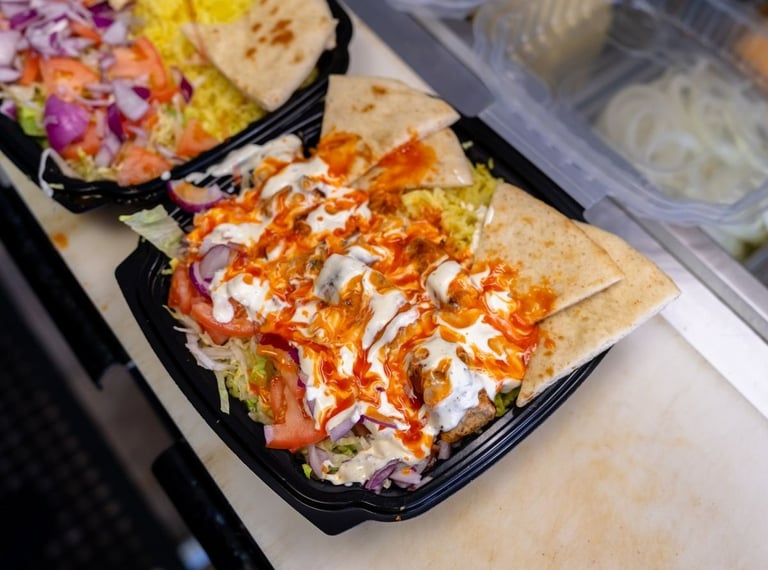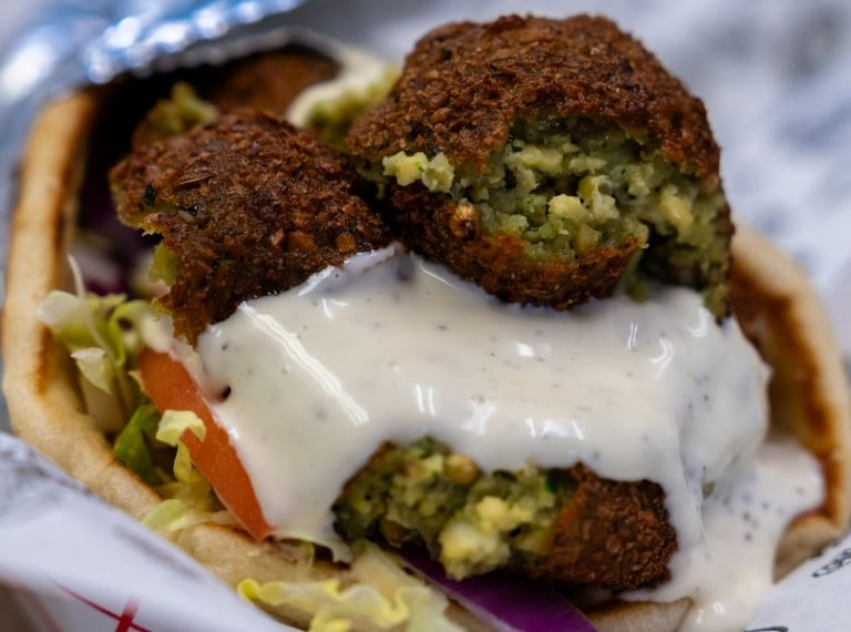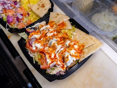 Mixture of ground chickpeas and fresh vegetables tossed in spices and deep-fried. Served with lettuce, tomato, onion, and Tzatziki sauce.