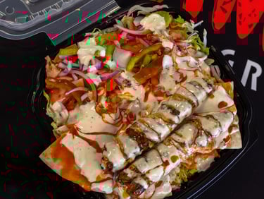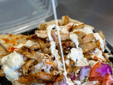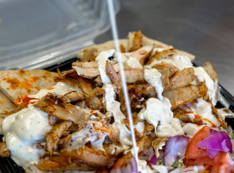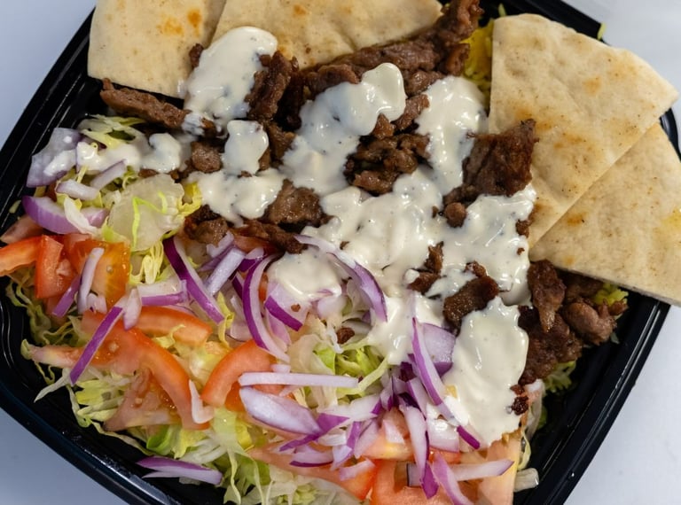 Thin sliced chicken marinated in our special blend spices and slowly cooked on stand-up rotisserie. Served with lettuce, tomato, onion, and garlic sauce.